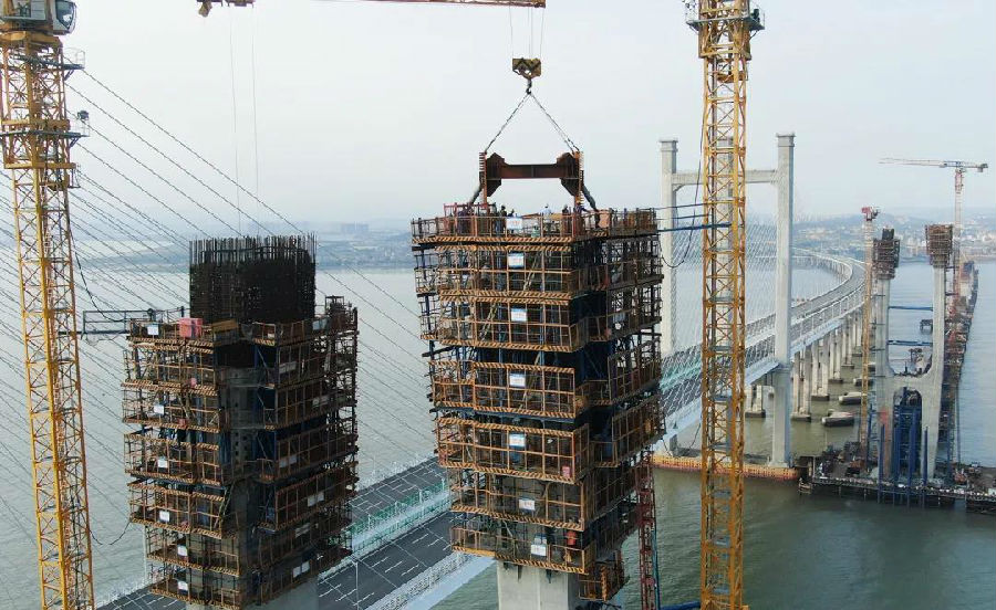 福州至厦门高速铁路是我国东南沿海客运铁路的重要组成部分,其中由中交二航局承建的全线重点控制性工程——泉州湾跨海大桥项目全长20公里,海上桥梁长约9公里,是国内首座跨海高铁大桥。10月中旬,大桥南北两岸间隔400米的两座主塔顺利封顶。在两座主塔的墩塔半腰上,整齐有序地排放着60个钢锚梁,它们作为桥梁荷载的重要承重构件,就像一根根长长的“扁担”,用于连接主桥与斜拉索。“传统的钢锚梁大多采用普通钢材焊接,通过表面刷漆来防腐,但在沿海地区高盐高湿的气候条件下,光靠刷漆很难满足高铁工程结构百年抗腐蚀的标准。”翁方文介绍。