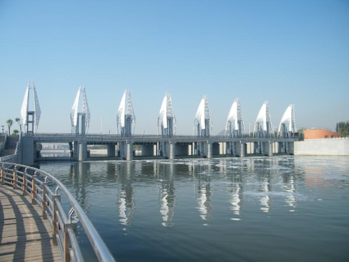 一渠清水,两纵石堤,杨柳依依,洪园节制闸7对闸门如7对洁白羽翼,优雅矗立在青天碧水之中,着实美不胜收。洪园节制闸还有个响当当的名头——小清河上第一闸。作为济南主城区唯一泄洪河道上最重要的一道控制性闸,它对市区防洪可以说起着决定性作用,更关乎着小清河上游千万济南市民的生命安全。“汛期泄洪保证济南市汛期安全,非汛期在上游形成景观水面。”这是洪园节制闸在规划之初就被赋予的功能。