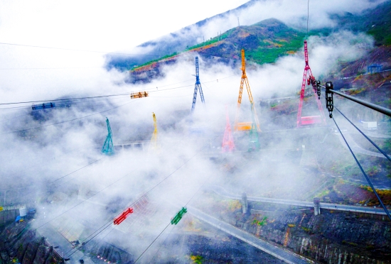 “你看到云雾中这些彩色的机械了吗?这是我们白鹤滩水电站的缆机群,是我们的‘七仙女。”