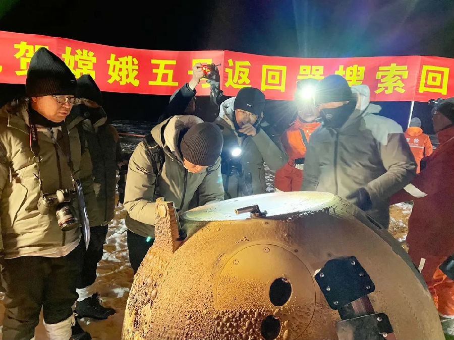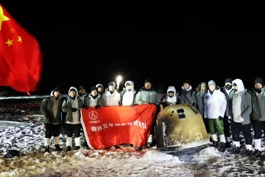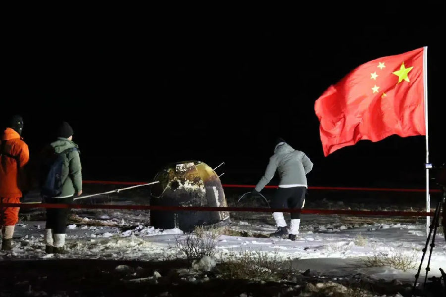“弹伞舱盖!”回家之路启动了最后的回收程序,红白相间的降落伞在内蒙古四子王旗草原的夜空中完美展开,嫦娥五号如仙女般翩跹而至。这一刻,怀抱着“嫦娥”的冰雪世界宁静而美好。