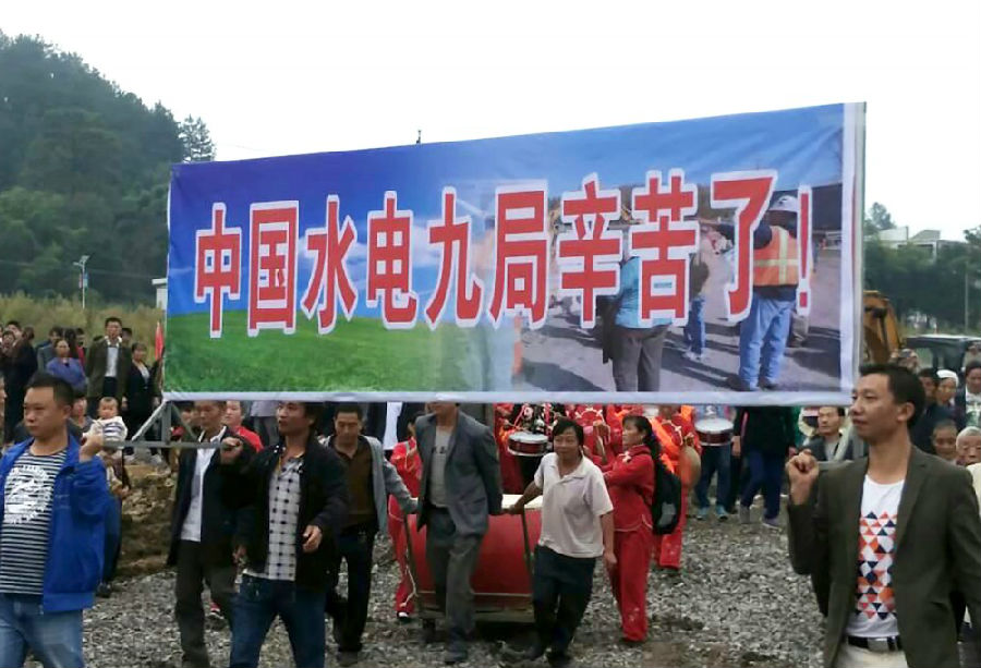 2016年9月的一天,在桐梓县的一个工地上,来自当地数百名群众自发赶来,他们肩扛展板、手推鼓车、腰缠腰鼓,打着“中国水电九局辛苦了”的鲜明条幅,一路上甚是热闹。得知大企业水电九局要帮助他们修致富路,周围的村民拖家带口都赶来了,高峰时现场有上千人之多,他们的笑脸上都充满了无限希冀与期待。