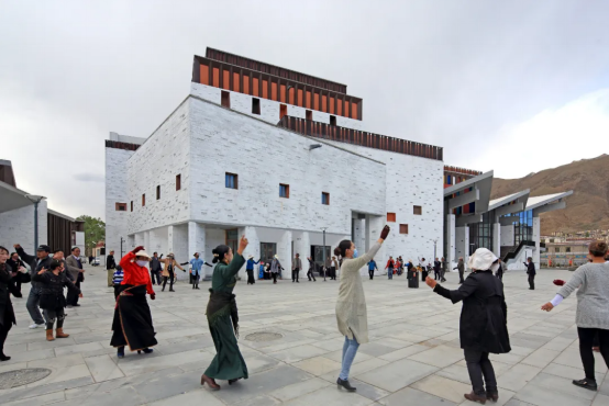 在扎曲河畔,玉树康巴艺术中心汇集了原玉树州的剧场、剧团、文化馆和读书馆等多种功能,总体布局自由松散但错落有致,强调与塔尔寺、唐蕃古道商业街、格萨尔广场等周边城市元素的对位呼应。如今,中心广场已经成为居民们的舞台。
