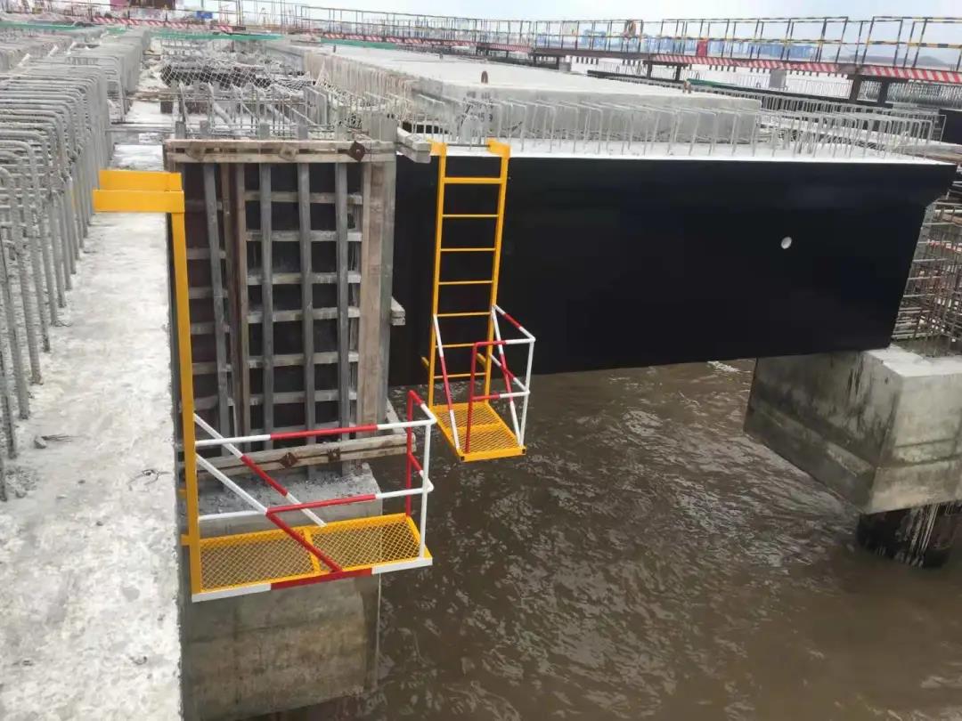 操作平台被吊装到指定位置焊接加固,依附在高桩上,底部和四周铺设防护网,作业人员通过爬梯进入平台,便可在里面进行施工动作。桩帽节点施工时安全带无处系的极端条件问题也被解决,操作平台“首秀”赢得了满堂喝彩。