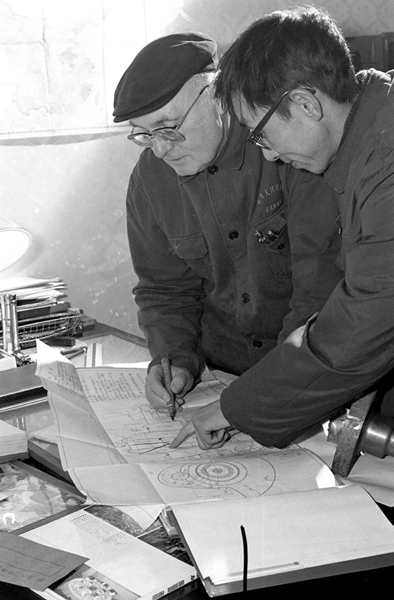 图为格里希与文远海一起研究柴油机曲轴的工艺图纸。新华社资料图片