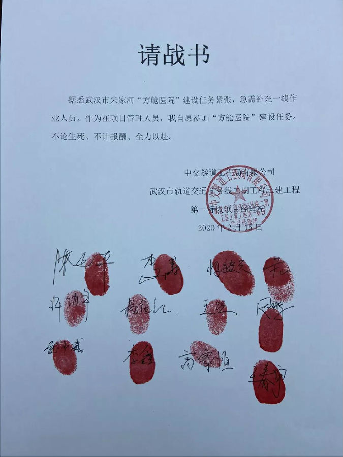 80后项目经理、党员陈延平立即召开全体人员会议,“特殊时期,大家已连续奋战多天,但‘前线’急需支援,项目成立青年突击队,自愿报名,我是党员,我报名。”“我是党员,我先上!”青年党员王春宇第一个请战,不到5分钟,由12名平均年龄不到30岁青年人组成的突击队组建完成。出征前,突击队员立下《请战书》:我自愿参加“方舱医院”建设任务,不论生死,不计报酬、全力以赴,请战书上12个亲笔签名和鲜红指印,见证着队员们的青春担当和必胜决心。