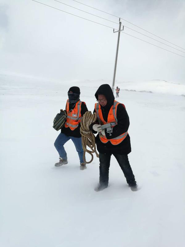 雪还在继续下着,风也更急了。凌晨3点多,白塔子工区抢修队员到达天河梁,这里的积雪比想象中的要厚很多,车辆根本无法正常通过。王永杰说:“咱们务必在最短时间内查出故障,没有车,扛也得把设备扛进去!”9级大风夹杂着雪花,吹得队员们睁不开眼睛。为了在恢复供电上赢得宝贵时间,又寒又饥、疲惫不堪的他们,渴了喝一口带冰碴的矿泉水,饿了嚼上一口方便面,接着赶赴下一个地点排障。