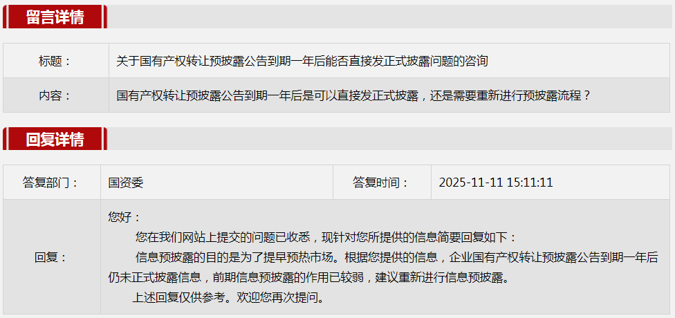 3.关于国有产权转让预披露公告到期一年后能否直接发正式披露问题的咨询