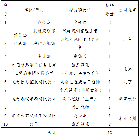 根据工作需要,经研究,现在全社会范围内公开招聘中国通号股份公司总部工作人员、二级企业管理人员,具体情况如下: