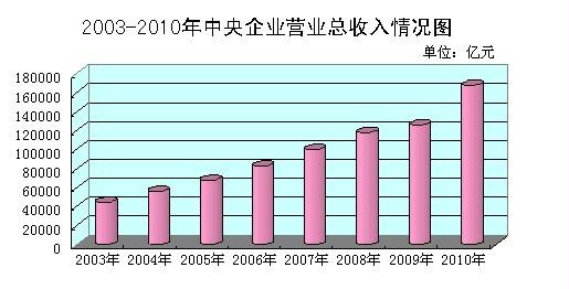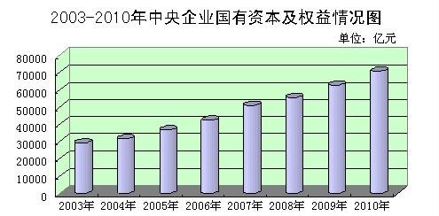 二、经营规模情况。截至2010年底,中央企业资产总额244274.6亿元,比上年增长16%;所有者权益(净资产)总额95664.9亿元,比上年增长13.9%,其中:归属于母公司所有者权益为70889.2亿元,比上年增长12.6%。2010年度中央企业实现营业总收入167769.4亿元,比上年增长32.9%。在全部中央企业中,2010年底资产总额超过千亿元的企业有57家,比上年增加4家;2010年度实现营业收入超过千亿元的企业有43家,比上年增加5家。在美国《财富》杂志2011年公布的世界500强企业中,中央企业有38家,比上年增加8家,比2003年增加32家。