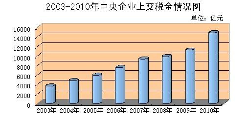 四、上交税金情况。2010年度中央企业上交税金总额14840.4亿元(含石油特别收益金898.9亿元),比上年增长31.7%,比2003年增加11220.5亿元,七年间年均增加1602.9亿元,年均递增22.3%。在全部上交税金中,增值税4685.7亿元,占上交税金总额的31.6%;企业所得税2911.9亿元,占19.6%;消费税2533.0亿元,占17.1%;营业税1317.6亿元,占8.9%;石油特别收益金898.9亿元,占6.1%。2010年度上交税金总额超过百亿元的中央企业有25家,比上年增加2家,比2003年增加18家。