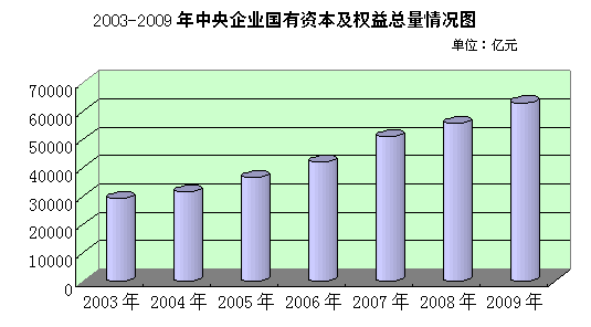 一、国有资产保值增值情况。2009年末,129家中央企业拥有国有资本及权益为62930.9亿元,比2009年初增加6987.4亿元,增幅为12.5%;比2003年增加3.4万亿元,年均递增13.7%。在本年国有资本及权益净增加额中,因国家追加投资、资本溢价、无偿划入等客观因素增加3508.8亿元,因无偿划出、自然灾害损失、上缴国有资本经营收益等客观因素减少1743.9亿元。扣除各项客观增减因素后,2009年中央企业平均国有资产保值增值率为109.3%。在全部中央企业中,2009年实现国有资产保值增值的企业有119家,占92.2%;国有资产保值增值率超过110%的企业有67家,占51.9%。