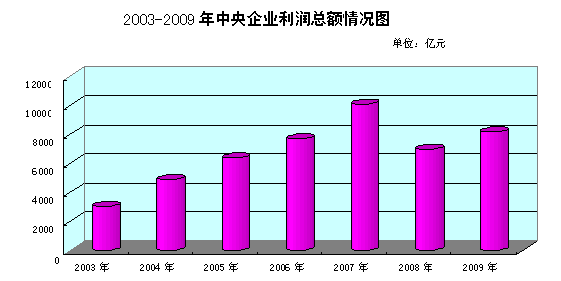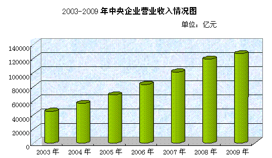 二、经营规模情况。截至2009年底,中央企业资产总额210580.8亿元,比上年增长19.5%;净资产总额83968.9亿元,比上年增长14.6%。2009年中央企业实现营业总收入126271.6亿元,比上年增长6.4%。在全部中央企业中,2009年底资产总额超过千亿元的企业有53家,比上年增加8家;2009年实现营业总收入超过千亿元的企业有38家,比上年增加5家。在美国《财富》杂志2010年公布的世界500强企业中,上榜的中央企业有30家,比上年增加6家,比2003年增加24家。