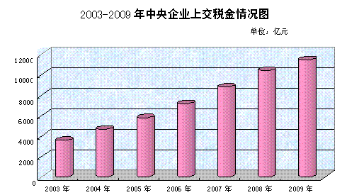 四、上交税金情况。2009年中央企业实际上交税金总额11474.8亿元(含石油特别收益金680亿元),比上年增长10.1%,比2003年增加7911.7亿元,六年间年均增加1318.6亿元,年均递增21.5%。在全部上交税金中,增值税3782.3亿元,占上交税金总额的33%;企业所得税2203.7亿元,占19.2%;消费税2071.9亿元,占18.1%;营业税1050.2亿元,占9.2%;石油特别收益金680亿元,占5.9%。2009年实际上交税金总额超过百亿元的中央企业有23家,比上年增加1家,比2003年增加15家。