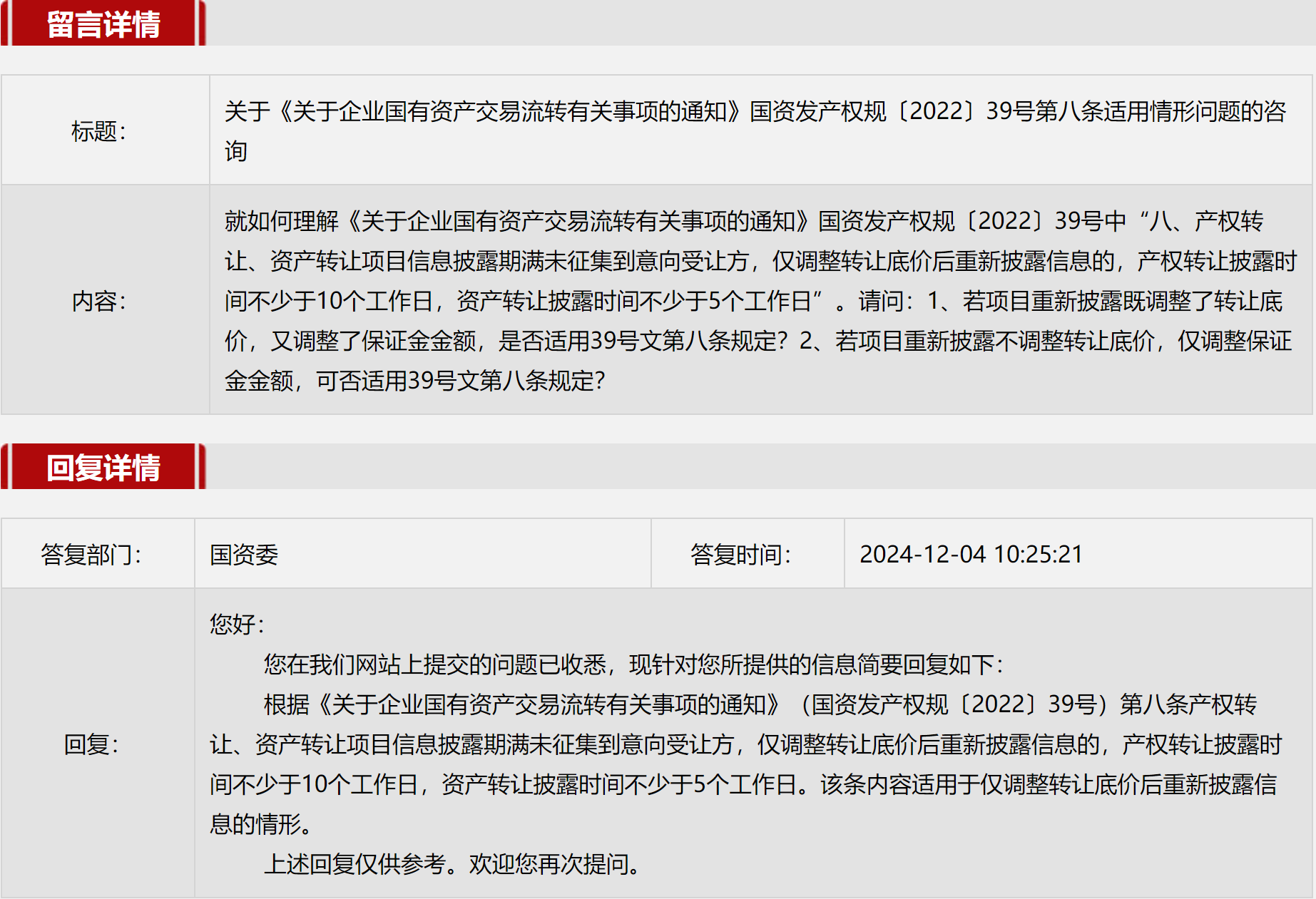 1.关于《关于企业国有资产交易流转有关事项的通知》国资发产权规〔2022〕39号第八条适用情形问题的咨询
