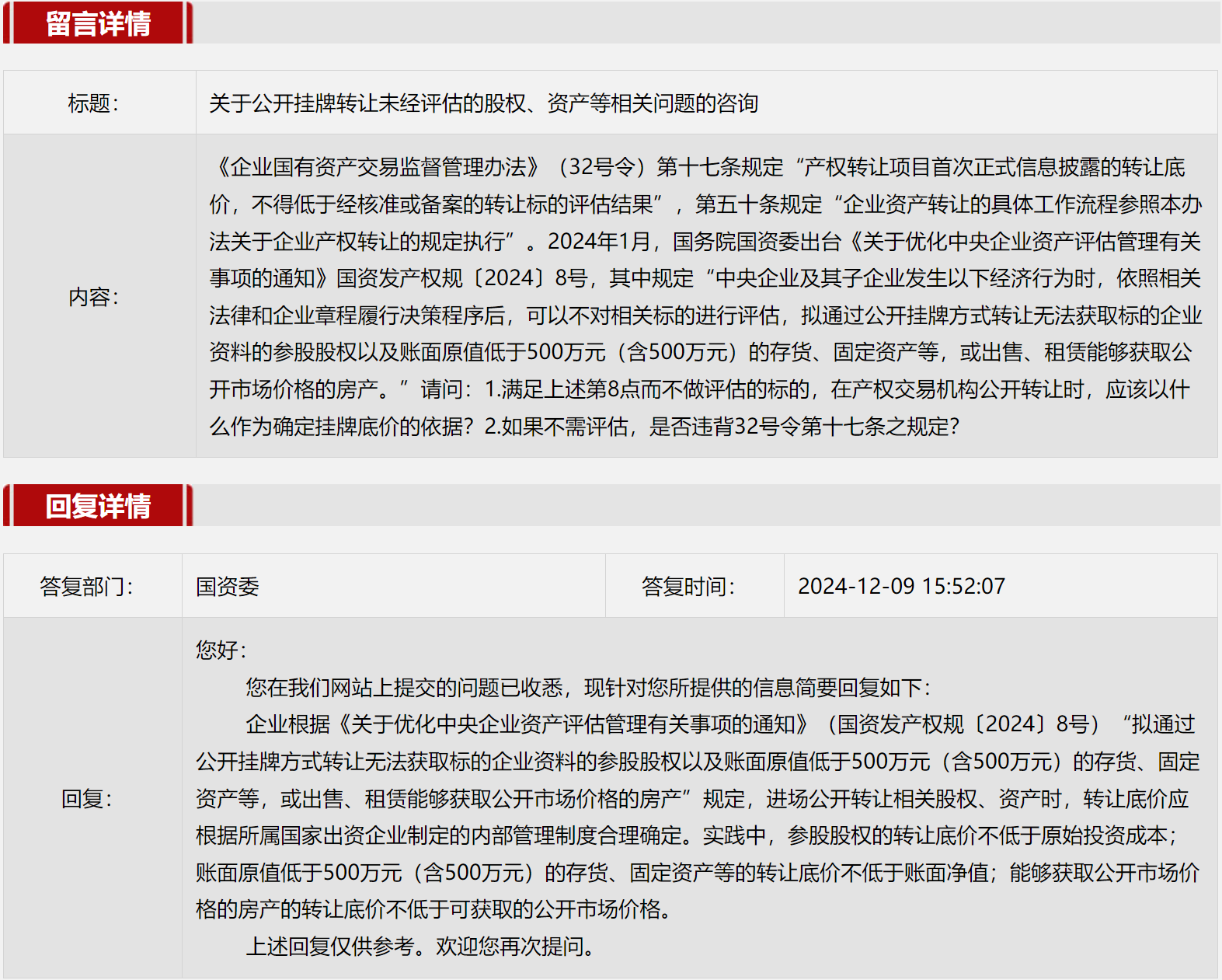 2.关于公开挂牌转让未经评估的股权、资产等相关问题的咨询