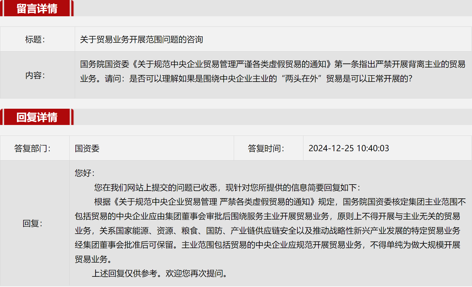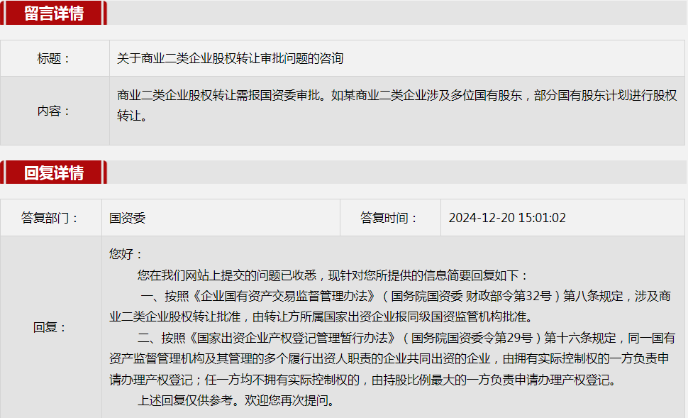 2024年12月国务院国资委网站政务咨询栏目部分网友提出的咨询,我们初步做出了认真的回应,现选择五条关注度高、点击量高的问题,再次推荐分享。