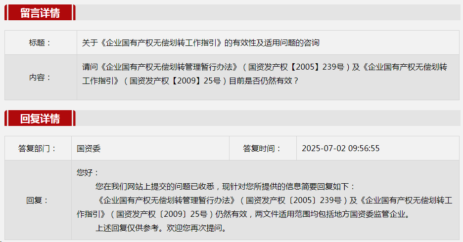 1.关于《企业国有产权无偿划转工作指引》的有效性及适用问题的咨询