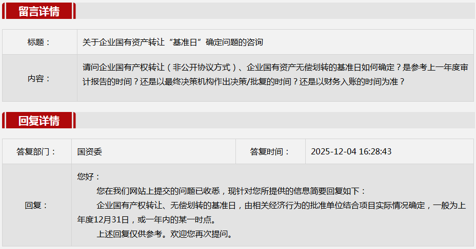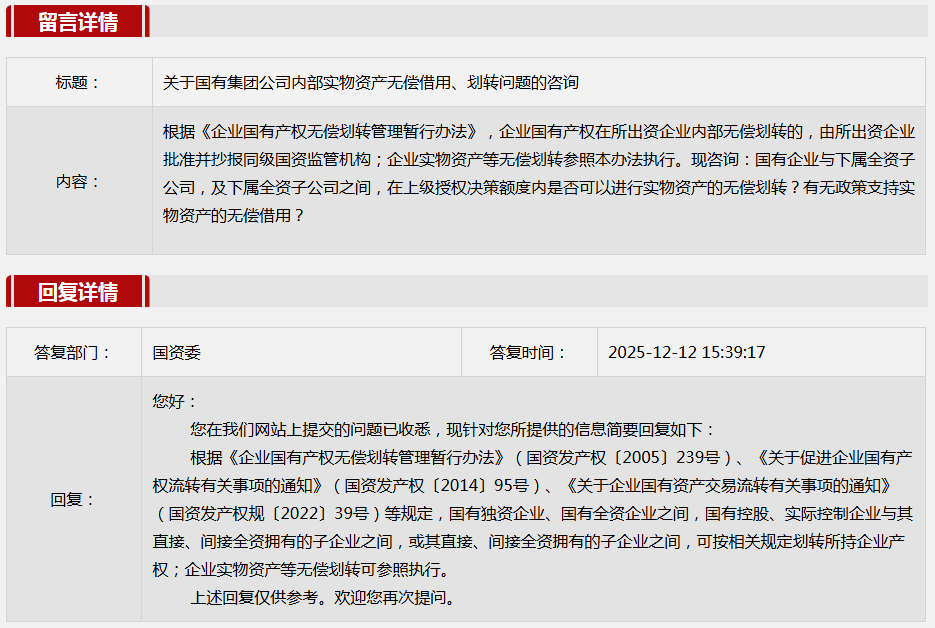 2025年12月国务院国资委网站政务咨询栏目部分网友提出的咨询,我们初步做出了认真的回应,现选择五条关注度高、点击量高的问题,再次推荐分享。