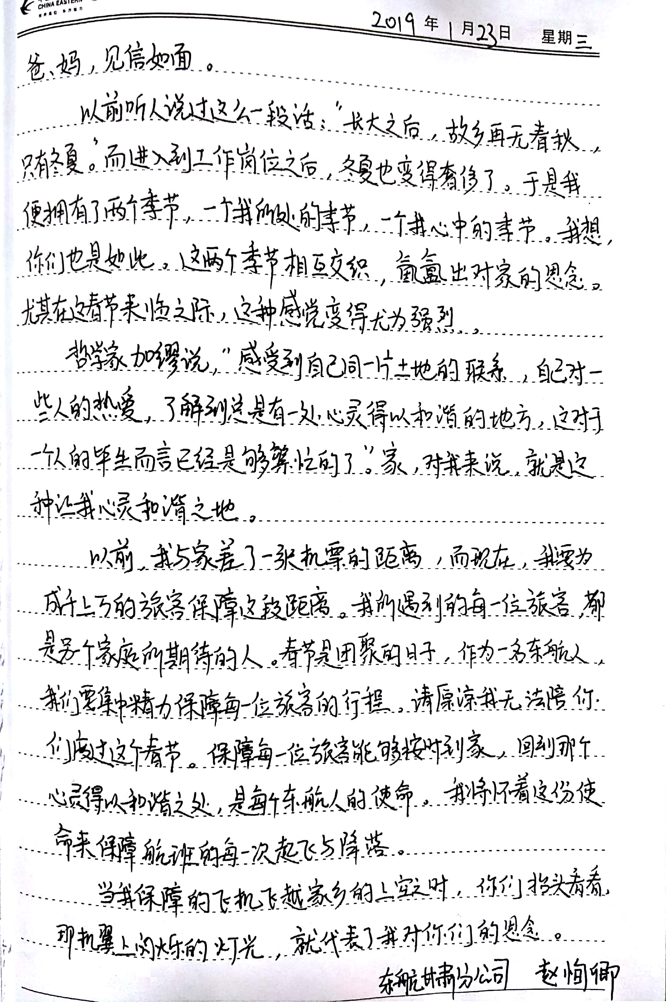 以前,我与家差了一张机票的距离,我现在,我要为成千上万的旅客们保障这段距离。我所遇到的每一个旅客,都是另一个家庭所期待的人。春节是团聚的日子,作为一名东航人,我们要集中精力来保障每一位旅客的行程。请原谅我无法陪你们度过这个春节。保障每一位旅客能够按时回家,回到那个心灵得以和谐之处,是每个东航人的使命。我将怀着这份使命来保障航班的每一次起飞与降落。