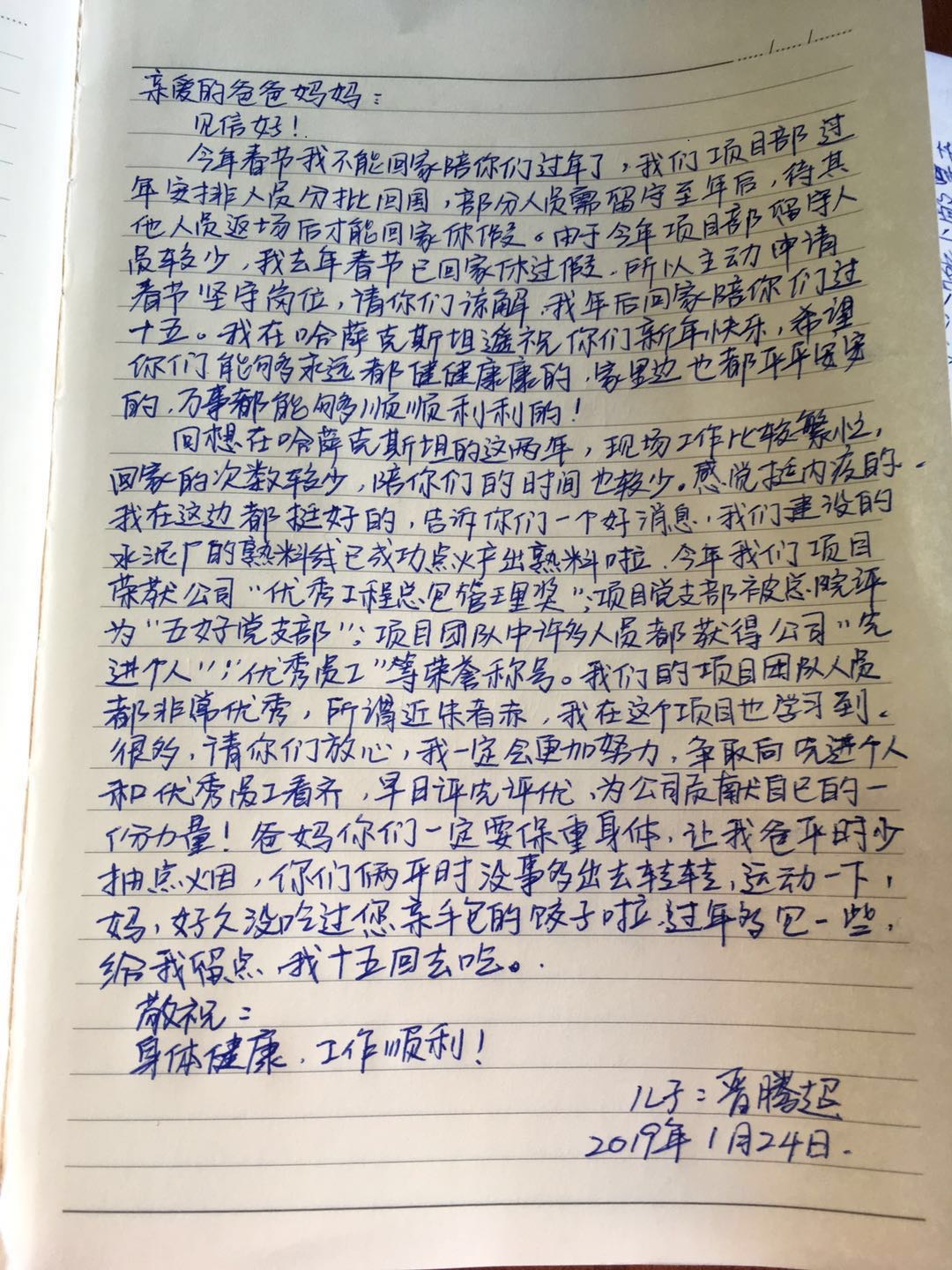 回想在哈萨克斯坦的这两年,现场工作比较繁忙,回家的次数较少,陪你们的时间也较少,感觉挺内疚的。我在这边都挺好的,告诉你们一个好消息,我们建设的水泥厂的熟料线已成功点火产出熟料啦!今年我们项目荣获公司“优秀工程总包管理奖”;项目党支部被总院评为“五好党支部”,项目团队中许多人员都获得公司“先进个人”“优秀员工”等荣誉称号。我们的项目团队人员都非常优秀,所谓近朱者赤,我在这个项目也学习到很多,请你们放心,我一定会更加努力,争取向先进个人和优秀员工看齐,早日评先评优,为公司贡献自己的一份力量!爸妈你们一定要保重身体,让我爸平时少抽点烟,你们俩平时没事多出去转转,运动一下。妈,好久没吃过您亲手包的饺子啦,过年多包一些,给我留点,我十五回去吃。