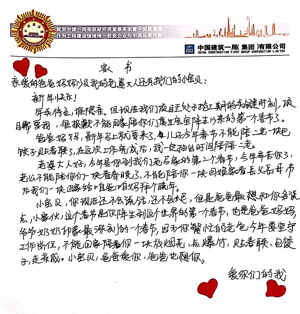 爸爸妈妈,新年马上就要来了,儿子今年春节不能陪二老一块包饺子贴春联了,在这次工作完成后,我一定抽出时间陪陪二老。