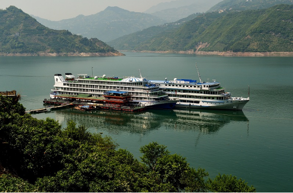 如今,在三峡核心区,所有游轮已全部用上清洁岸电。图为一艘游轮停靠湖北秭归县归州镇港口码头。