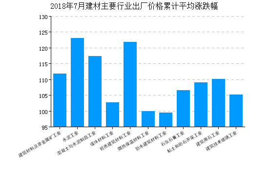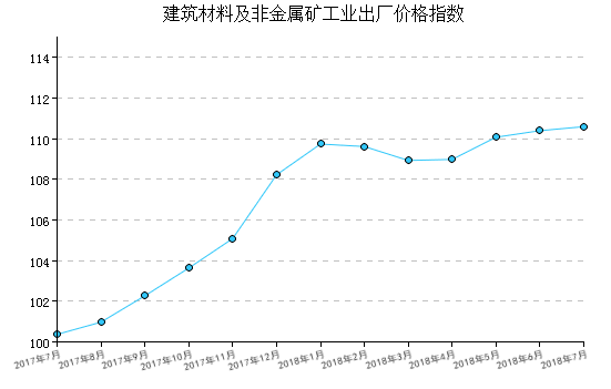 2018年7月,建材价格指数为110.59,比上月上涨0.18%,比去年同月上涨10.18%,一月至本月平均比去年同期上涨11.35%。 价格指数比上月上涨的行业有:混凝土与水泥制品工业、轻质建筑材料工业、隔热保温材料工业、石灰石膏工业、粘土和砂石开采工业、建筑技术玻璃工业、;价格指数比上月下降的行业有水泥工业、墙体材料工业、防水建筑材料工业、建筑用石工业。