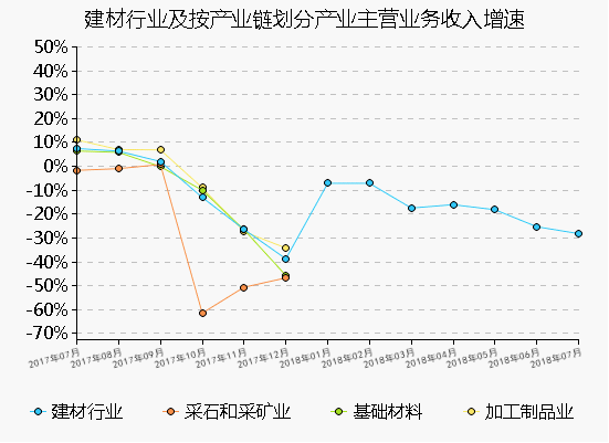 2018年7月规模以上工业增加值同比增长6.00%,累计增长6.60%。 跟其他工业行业相比,建材行业增加值增速低于设备制造、电器机械和器材制造、电力、热力生产及供应等行业,高于化学原料和化学品制造、黑色金属冶炼和压延、有所金属冶炼和压延等行业。
