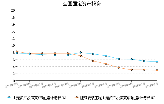 2018年8月全国固定资产投资累计增速增长5.3%,其中建筑安装工程投资累计增速增长2.9%。 图 4:全国固定资产投资情况