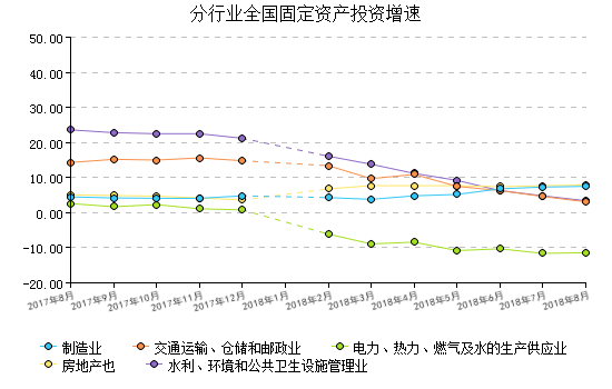 2018年8月规模以上工业增加值同比增长6.10%,累计增长增长6.50%。 跟其他工业行业相比,建材行业增加值增速低于设备制造、电器机械和器材制造、电力、热力生产及供应等行业,高于化学原料和化学品制造、黑色金属冶炼和压延、有所金属冶炼和压延等行业。