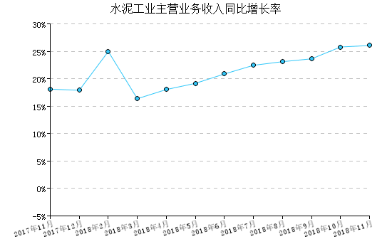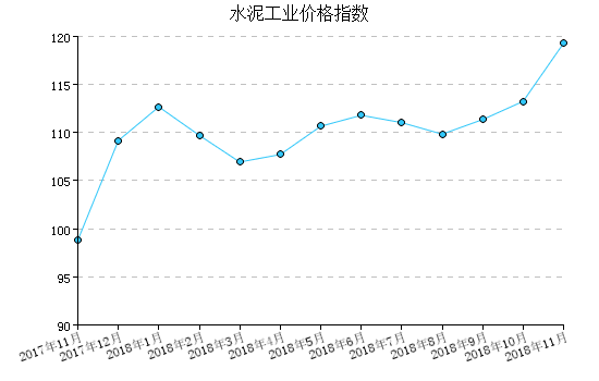 2018年11月,水泥工业产品出厂价格指数为119.30,比上月上涨5.34%,比去年同月上涨20.72%,一月至本月平均比去年同期上涨22.53%。