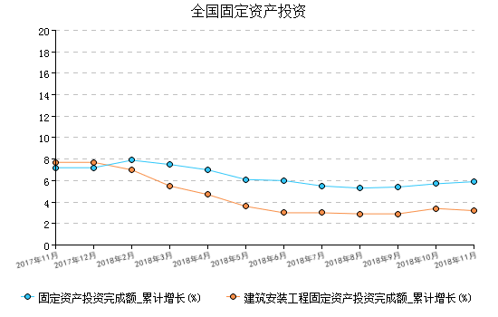 2018年11月全国固定资产投资累计增速增长5.9%,其中建筑安装工程投资累计增速增长3.2%。