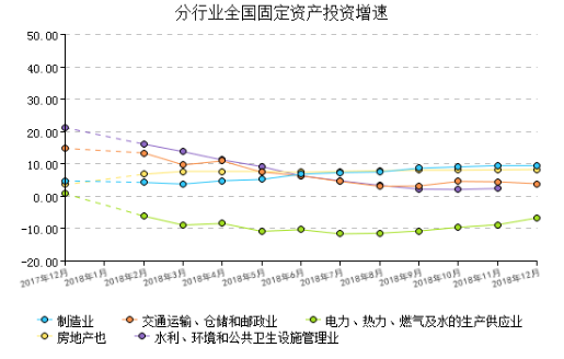 分行业来看:房地产业累计投资增速增长8个百分点;水利、环境和公共设施投资增速保持持平个百分点;交通运输、仓储和邮政业投资增速增长4个百分点;制造业投资增速增长10个百分点。