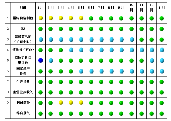 4、综合景气指数反映当前铅锌产业发展景气程度。景气灯号图把铅锌产业经济运行状态分为5个级别,“红灯”表示经济过热,“黄灯”表示经济偏热,“绿灯”表示经济运行正常,“浅蓝灯”表示经济偏冷,“蓝灯”表示经济过冷。对单项指标灯号赋予不同的权重,将其汇总而成的综合景气指数也同样由5个灯区显示。
