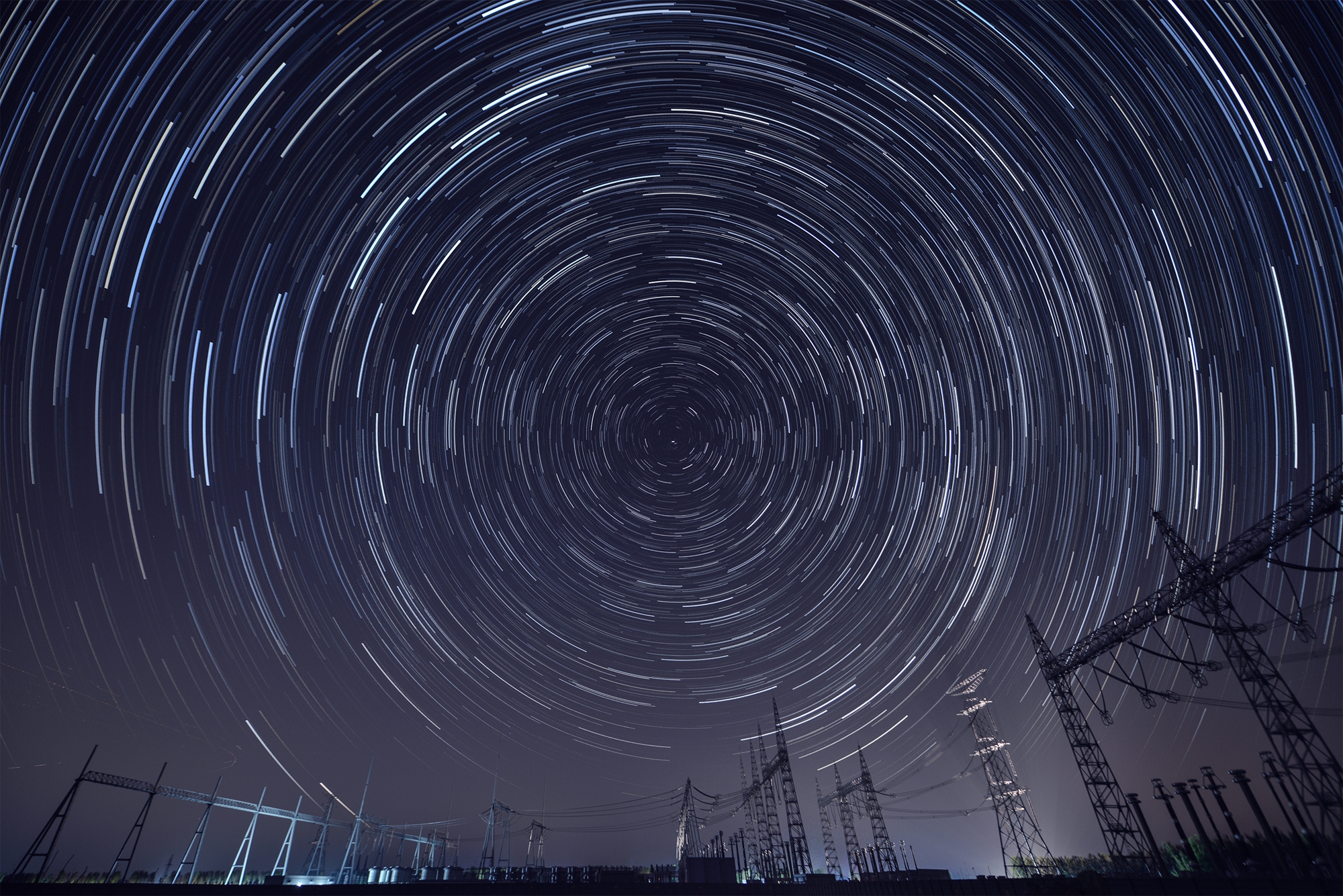 第一次拍星轨是2016年4月8日深夜。在北京周边拍摄星轨并不容易,时间只有阴历月末月初那几天,要没有雾霾和云层的遮挡,还要等到周围村庄的灯光熄灭。清明时节终于赶上了晴空万里繁星满天的好天气,我一个女生在站外的野地里一边拍摄,一边看不远处的坟堆旁有人在烧纸,脑海里满是《鬼吹灯》的故事情节,那感觉真的很刺激。到凌晨2点,冷风在耳边凄厉地呼啸而过,我终于坚持不住,开着车一溜烟跑回了家。本想在站内再拍一次,可之后两个月的月底开车过去,老天爷都没再给我好天气。后来变电站周边种满了树,就再也没有机会了。