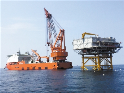图为海上升压站模块吊装现场。 (记 者 瞿 剑摄)