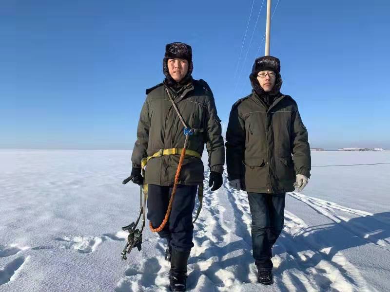 我和同事艾子翔深一脚浅一脚地走向满都拉家,走了差不多半个多小时,终于来到满都拉家,发现原来是有一相电源引线已经脱离设备线夹,找好“症结”所在,我们便布置现场安全措施。当登上光滑冰凉的电线杆时,凛冽的寒风刮在身上,阵阵刺骨。两个多小时后,线路终于抢修完成并恢复送电。从电杆上下来的我,帽子和眉毛都已经结了冰花。