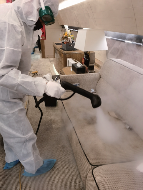 一次深度的杀菌消毒工作包括:内部深度清洁、内部消毒、地毯清洁、地毯蒸汽杀菌;全员身穿防护服、防护眼镜、防护口罩、防护手套及防护脚套,全方位防护并使用专用清洁工具是有效完成杀菌消毒任务保障。