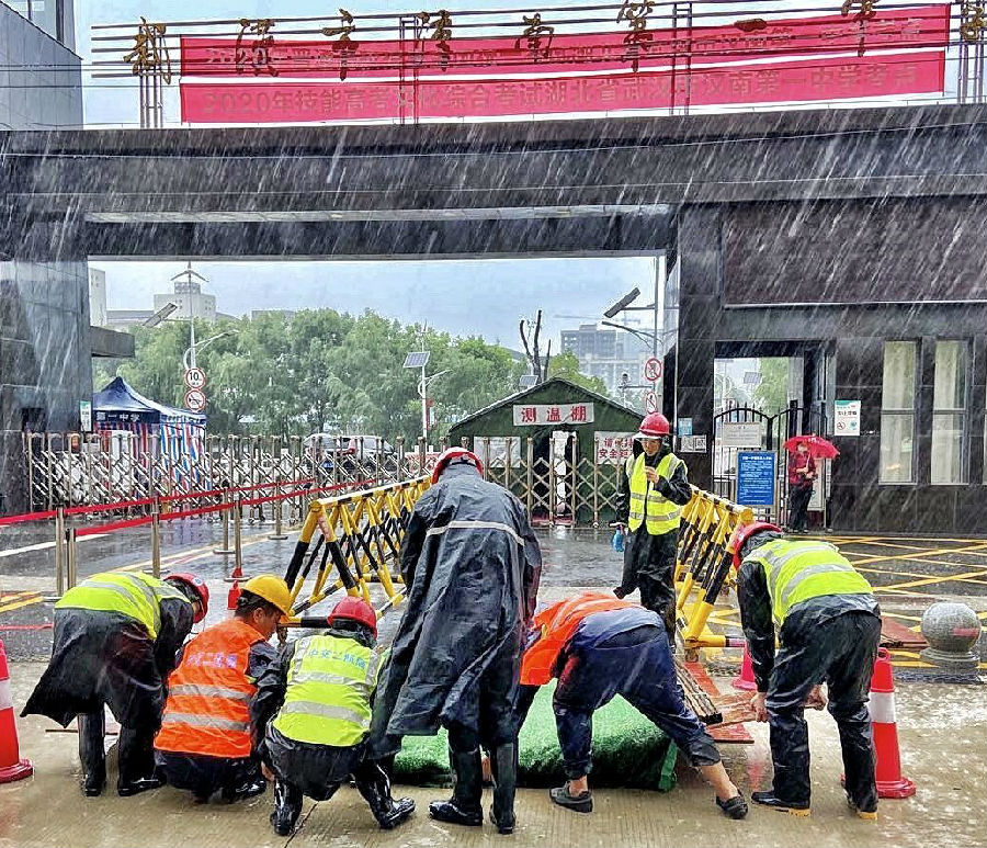 7月7日高考第一天,中交二航局马影河项目组建防汛应急救援抢险队赶往汉南一中校门口,搭建小型“浮桥”,保障考生通行。