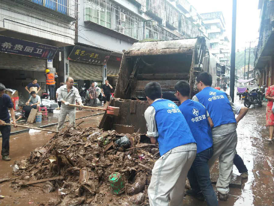 四川省合江县福宝镇遭遇特大暴雨,主干道被20厘米厚的淤泥杂物覆盖,中交一航局合江项目组织18人的突击队进行处理。