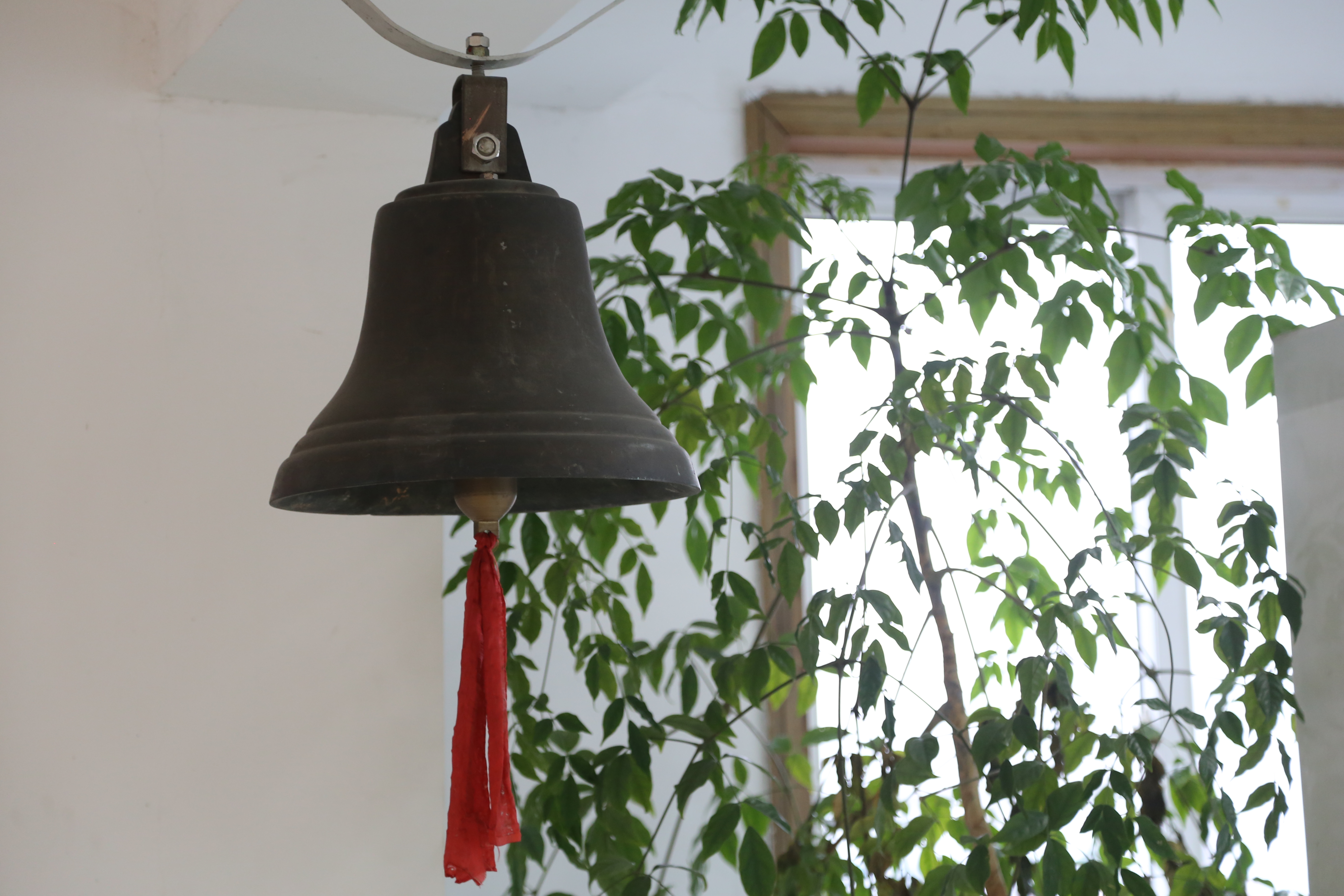 2016年,油库的仓库历经了一次搬迁,员工们逐一整理仓库内物品,让这枚小小的铜钟再一次“重见天日”。这一次,大家把他挂到了油库行政楼一楼大厅的横梁上,英信洲师傅利用自己多年的手艺,为他重新打磨了一枚崭新的钟锤,再系上一根鲜艳的红丝带,试着敲了一敲,没想到二十几年过去了,声音还是一如以往地响亮有力,仿佛逝去的岁月从未在它身上留下痕迹。