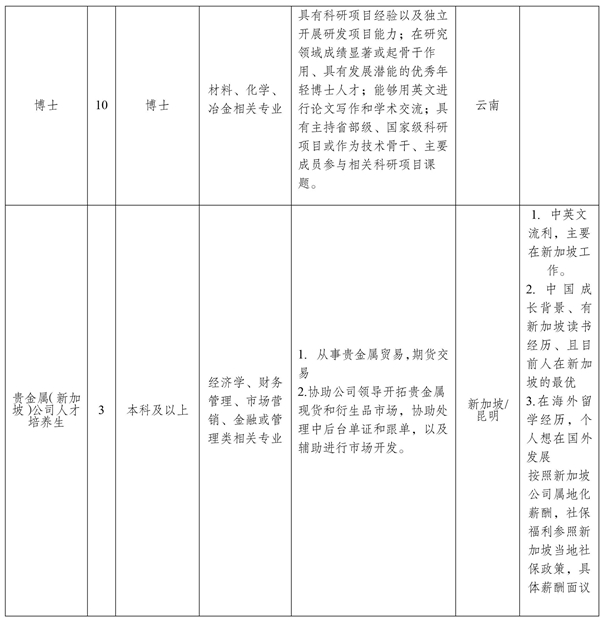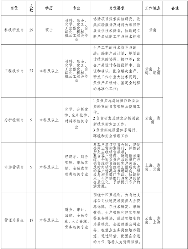 贵金属集团校园招聘岗位104个(本科及以上学历)。专业领域涉及材料、冶金、工业催化、化学、化工、自动化、机械加工、分析化学、质量管理、财务管理、市场营销、金融、会计、审计、法务等相关专业。