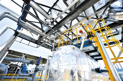 工作人员在陕西延长石油榆林煤化有限公司查看二氧化碳捕集装置运行情况。