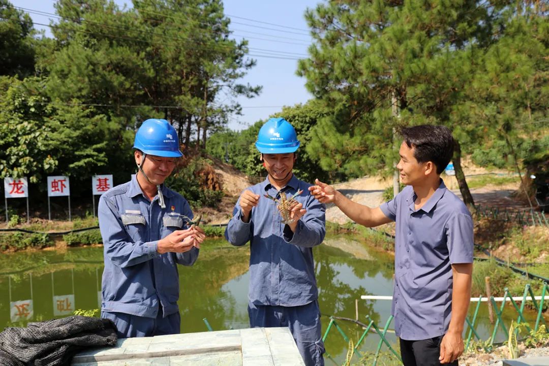 “南网兄弟”黄春强(中)、黄春宁(左)走访防城港市防城区十万山瑶族乡沙平村的溪水龙虾养殖基地