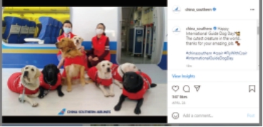 2021年4月的“世界导盲犬日”,南航发布了空乘与导盲犬的合影。画面中,导盲犬和空乘相处和谐,状态温馨美好,配合“感谢导盲犬”等温暖简短的语言,向世界传达出南航关爱残疾人群体、尊重认可动物生命价值的情怀。这一价值观与海外民众情感高度契合,收获了诸多正面反馈。