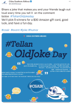 每年7月,北美地区有一个充满趣味的“老笑话日”。当日,人们会通过讲笑话的方式释放情绪。南航通过邀请粉丝分享生活中有趣的小笑话、小故事,与粉丝积极互动,收获了超1600条互动和近10万曝光量,文化的融合在轻松诙谐的氛围中得到有效推进。