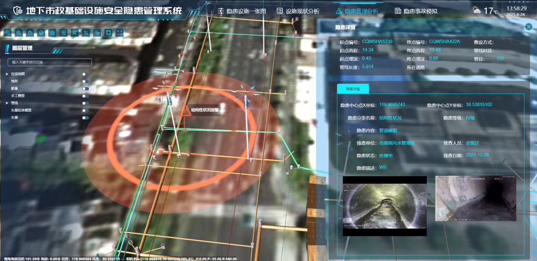 地下市政基础设施综合管理信息平台充分利用三维GIS、BIM、IoT、大数据、云计算等信息技术,汇聚地下市政基础设施数据、基础地理信息数据、三维模型数据、BIM模型数据等各类城市基础地下空间信息资源,接入管网压力、流量,井盖启闭状态等地下市政基础设施物联网动态监测数据,实现对城市级、大范围、多源异构的地下市政基础设施数字孪生信息集成管理、安全风险预测预警与辅助决策分析,有效减少管网泄漏、洪涝灾害、井盖缺失等引起的安全事故,保障城市地下市政基础设施安全、经济、节能的应用和运行,提升城市地下市政基础设施科学化、精细化、智能化管理水平。当前,平台已在北京、山东、浙江等地得到了较好的推广与应用,整体技术成果已逐步成熟。