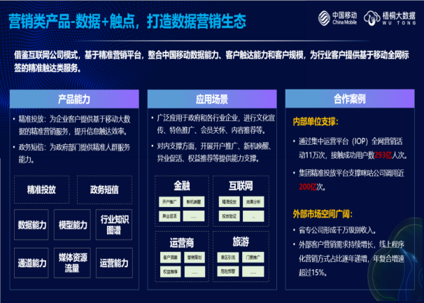 (二)应用推广领域:该成果在内外部支撑赋能方面,对内在营销、服务、管理等多个领域深入推广,促进智慧运营和降本增效;对外积极探索能力变现,在金融、文旅、互联网等多个细分行业初显成效,大数据合作生态不断扩大。