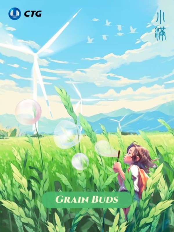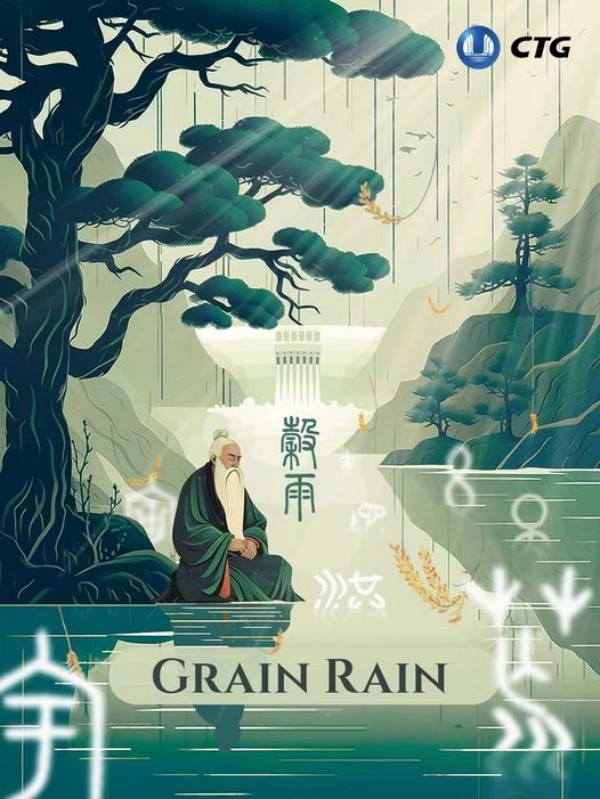 海报描绘了一个中国古代白胡子老爷爷安详地坐在树下,似乎在默默感受着谷雨时节的细雨润物。远处的大坝巍然屹立,展示着三峡集团的宏伟工程与巨大的社会贡献。
