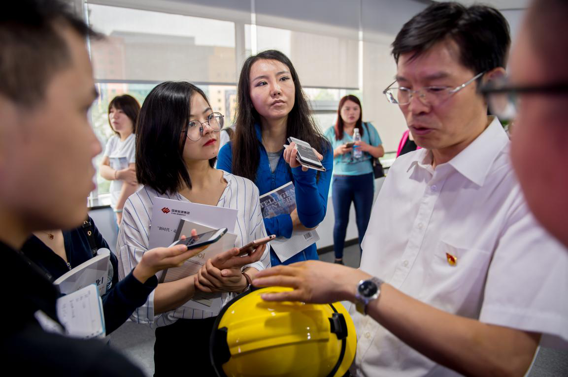 大渡河公司党委委员、副总经理周业荣向媒体记者介绍该公司研发的智能安全帽